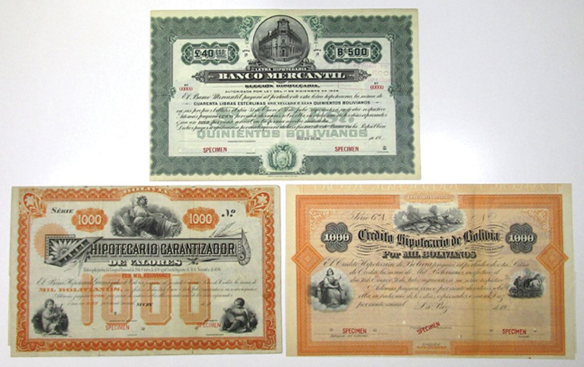Bolivia, ND (1880s-1920s). Lot of 3 Specimen Bonds, Includes: Hipotecario Garantizador de Valores, 1880's, 1000 Bolivianos Specimen Bond in Spanish, Black text with orange border and underprint, Allegorical woman at top holding scythe and wheat, ABNC; Banco Mercantil, 1900-20s, 500 Bolivianos - 40 Pounds Sterling, Specimen Coupon Bond, Black on green border and underprint, Bank building at top, ABNC; Credito Hipotecario De Bolivia, 1900-1920, 1000 Bolivianos Specimen Coupon Bond, Orange border and undertint with farm goods and implements on top flanked by man plowing on right and seated justice on left, An old National BNC design was used from the 1870s but the plate date was altered to the 1900s by ABNC who merged with NBNC in the later 1870s. Very attractive bond. All pieces have Specimen overprints and POCs and range from Fine to VF condition. (3). Sold "AS IS" no returns accepted.
