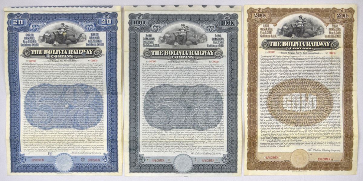 Bolivia, 1907. Lot of 3 Specimen Coupon Bonds, Includes: 20 Pound 5% First Mortgage Bond with blue border; 100 Pound 5% First Mortgage Bond with steel gray border; 200 Pound 5% Second Mortgage Income Bond with brown border, Bonds all have same vignette at top center, Specimen overprints and POCs, and range from XF to AU condition. ABNC. (3). Sold "AS IS" no returns accepted.