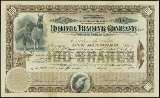 1902. Issued and uncancelled stock certificate. 100 Shares. Brown border. Llama on upper left and eagle on bottom. Incorporated in NJ. XF condition. Franklin-Lee BNC.