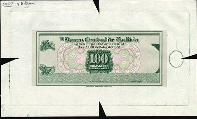 ca.1920-1949. P-Unlisted. 5; 100 Bolivianos 3 different border proofs used in the design of Bolivian banknotes. Border designs used for a proposed 1928 to 1949 issue by Security Banknote Company that was evidently rejected in favor of ABNC's design. VF to Unc. with archival markings and handling. SBNC.