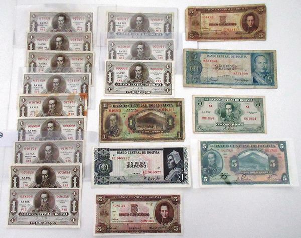 Bolivia, Lot of over 45 notes, includes man issues with some duplication, from VG to CU condition. Inspection a must. Sold "AS IS" No returns accepted.