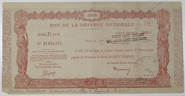France, 1918. French National Defense 100 Francs Issued Bond for National Defense in French, Brown text with brown border printed on tan paper. Stamp at bottom right, writing in blue at bottom margin. Fine condition with some splitting along fold lines. This 1918 bond was issued during the First World War to help finance the war effort, as it was lasting longer than anticipated. This national loan, also called the "liberator" loan, raised 55 billion francs through multiple propaganda posters.