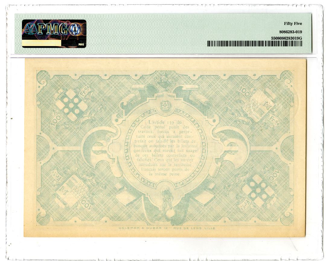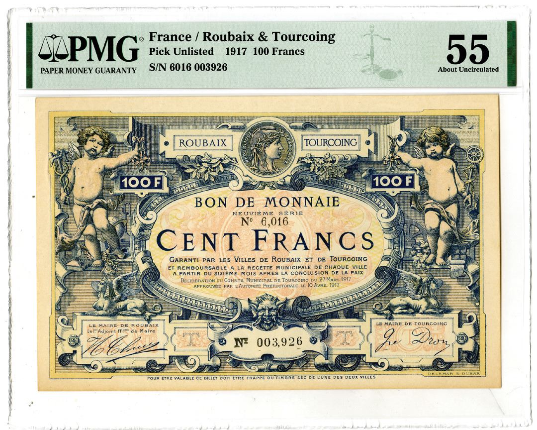 France/Roubaix & Tourcoing. 1917. 100 Francs, P-Unlisted, Issued banknote, Blue-gray with multicolor, S/N 6016 003926, PMG graded About Uncirculated 55.