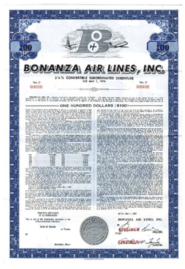Nevada. $100 Specimen 5 1/4% Convertible Subordinated Debenture Coupon Bond, Black print on blue border and under tint, Company logo at top, Specimen overprints and POC's, VF-XF condition, ABNC.