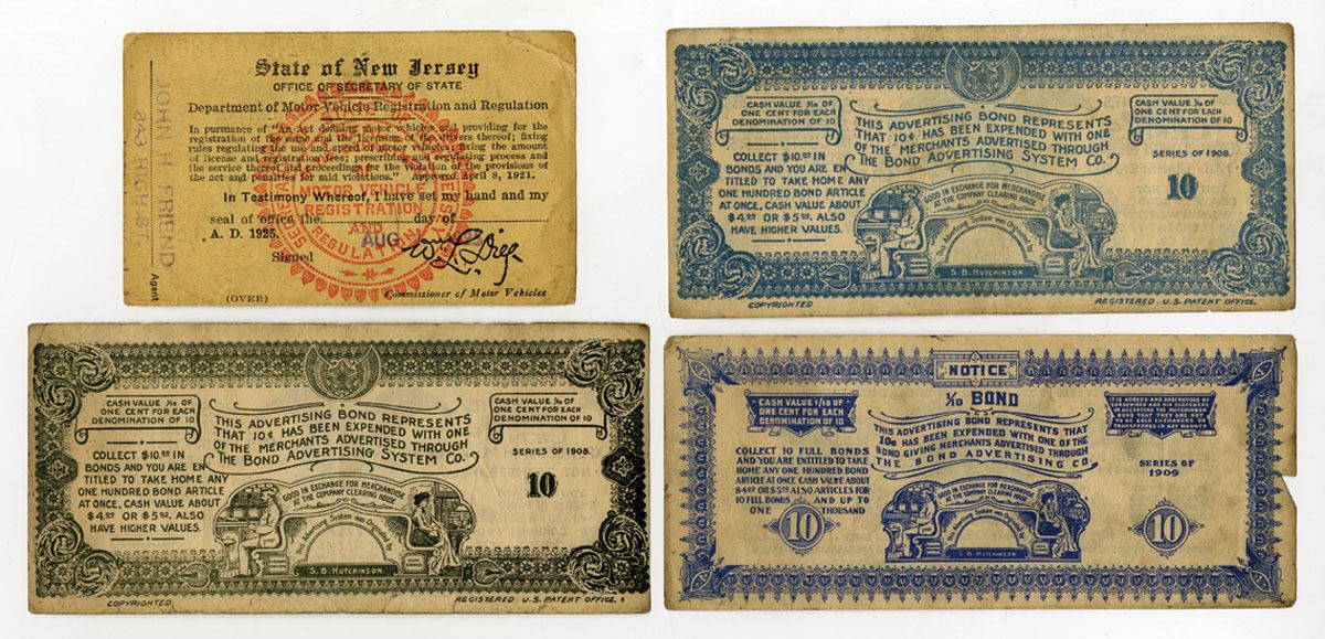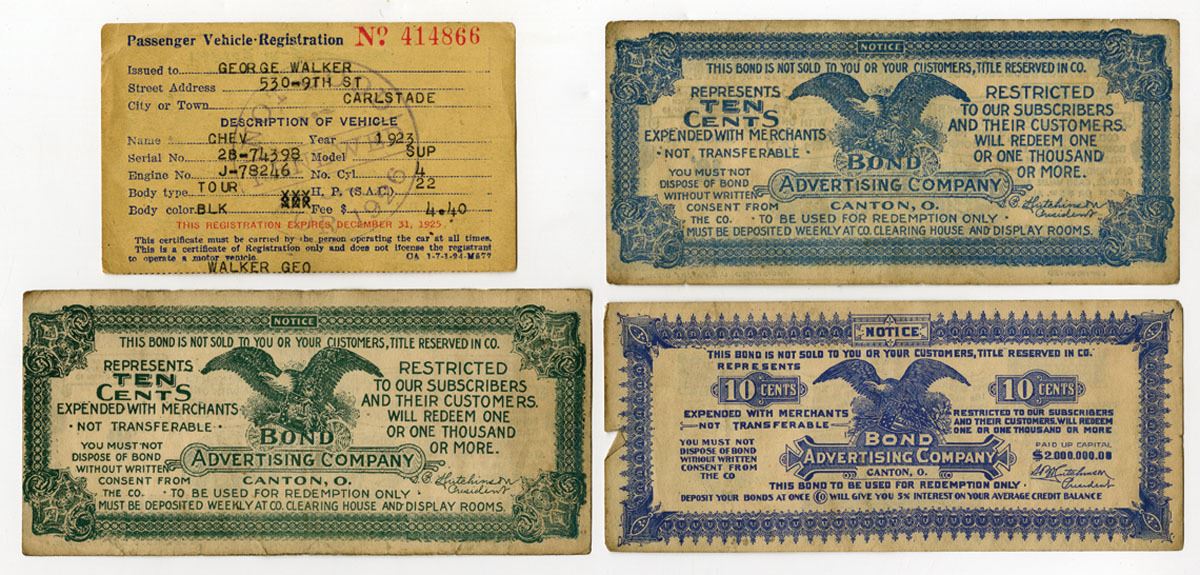 Ohio & New Jersey. Lot of 4 Documents, Includes: Trio of Scrip Notes for the Bond Advertising Co. and Car Registration for a Chevy in 1923. Items range from Fine to VF condition. (4).