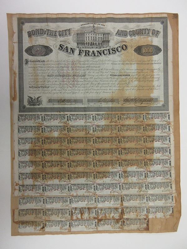 San Francisco, CA., $1000, #201, City Hall, 65 coupons, mounted on ledger book page, 16 1/2" x 21 1/2". Fully issued, cancelled. Some age toning (typical for this issue).