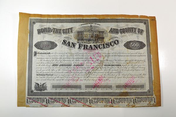 San Francisco, CA, 1858, $500 I/C, large building on top, eagle lower left, printed on thin paper and mounted on thin manila paper with coupons attached, ink cancelled, VG condition with toning and small edge tears on right, still scarce early Gold Rush related City Bond. Lith Britton & Co., S.F.