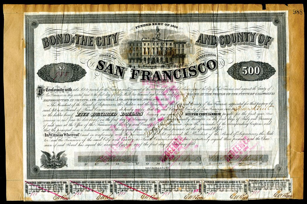 San Francisco, CA, 1858, $500 I/C, large building on top, eagle lower left, printed on thin paper and mounted on thin manila paper with coupons attached, ink cancelled, VG condition with toning and small edge tears on right, still scarce early Gold Rush related City Bond. Lith Britton & Co., S.F.
