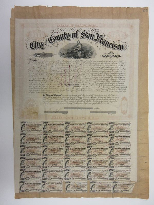 San Francisco, CA., $1000, #173, School Bond of 1870, Woman seated by globe, 30 coupons, mounted on ledger book page, 16 1/2" x 21 1/2". Fully issued, cancelled. Red border is faded, and there is light age toning (typical for this issue).