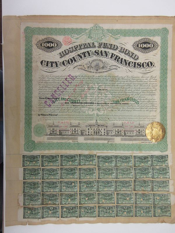 #34, Buildings near the bottom border, 40 coupons, mounted on ledger book page, 16 1/2" x 21 1/2". Fully issued, cancelled. Green borders and underprint, gold seal. Very light age toning. Nicer than most we've seen.