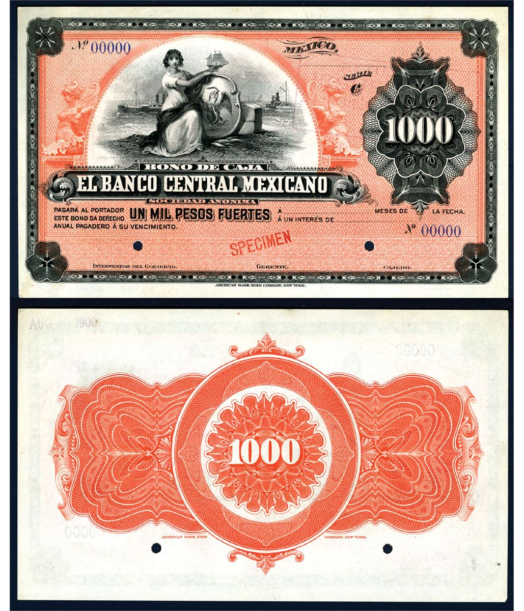 Mexico., ND (1900). 1000 Pesos, Ser.C, P-Unlisted, Specimen banknote, Black on red underprint with allegorical woman with Arms of Mexico flanked by steamboat and ship, back orange, Specimen overprint, POC's "00000" serial numbers. Choice to Gem Uncirculated except for 1 pin hole on the lower left margin. Rare note in any format. ABNC.