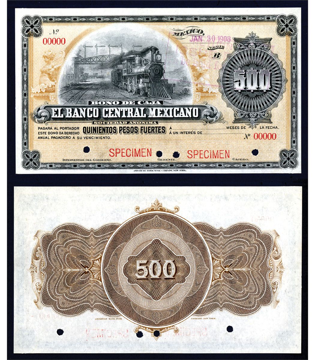 Mexico, ND (Jan 30 1908 typed in purple on top right), 500 Pesos Fuertes, Series B, P-Unlisted, Specimen, Black border, vignette and title with light brown underprint, locomotive passing signal towers on left, Back is brown with cycloid engraving and denomination. Unc. to CU condition with extremely faint paper clip mark on the upper left top margin, exceptional paper quality, bright colors and extremely artistic and tasteful design. Red specimen overprint, POC's and "00000" serial numbers. Rare circulating bond issued by the bank. ABNC.