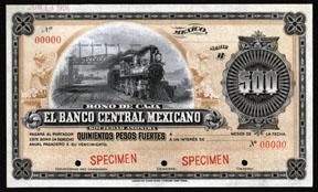 ND (1906), Ser. B. 500 Pesos, P-Unlisted, Specimen Bono De Caja banknote. The text has a blank space for the interest amount. Black on light yellow-brown undertint with locomotive, back is brown and has denomination. Red specimen overprint, POC and "00000" serial numbers. Archival hand stamped date of "Jun 1906" on top left border. AU to AU+ condition with a light internal bend due to mishandling. ABNC. Rare Mexican banknote.