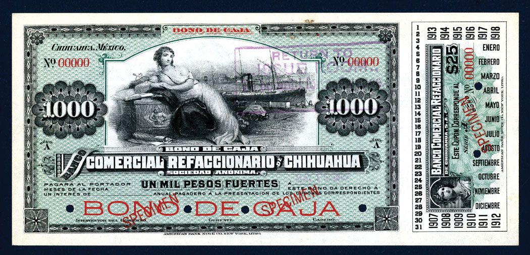 Chihuahua, Mexico. ND (ca.1907), Ser. A. 1000 Pesos, P-Unlisted, Specimen Bono De Caja banknote. Black and red on light green undertint with reclining allegorical woman with steamship at dock and train, back is green. There is a single coupon for $25 on the right border with dates from 1907 to 1918. Red specimen overprint, POC and "00000" serial numbers. The text has a blank space for the interest amount. Uncirculated condition with small stain on the top right border. ABNC. Rare "Bono De Caja" circulating bond banknote.