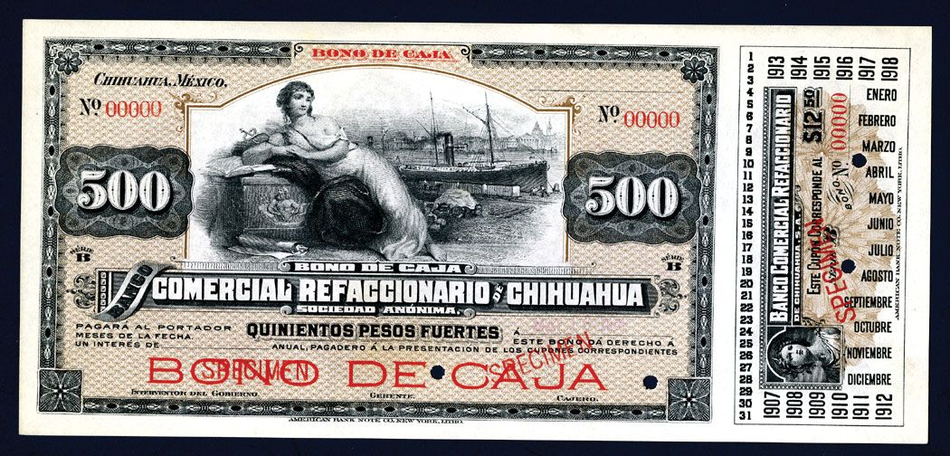 Chihuahua, Mexico. ND (ca.1907), Ser. A. 500 Pesos, P-Unlisted, Specimen Bono De Caja banknote. Black and red on light brown undertint with reclining allegorical woman with steamship at dock and train, back is green. There is a single coupon for $12.50 on the right border with dates from 1907 to 1918. Red specimen overprint, POC and "00000" serial numbers. The text has a blank space for the interest amount. Uncirculated to CU condition with small stain on the top right border. ABNC. Rare "Bono De Caja" circulating bond banknote.