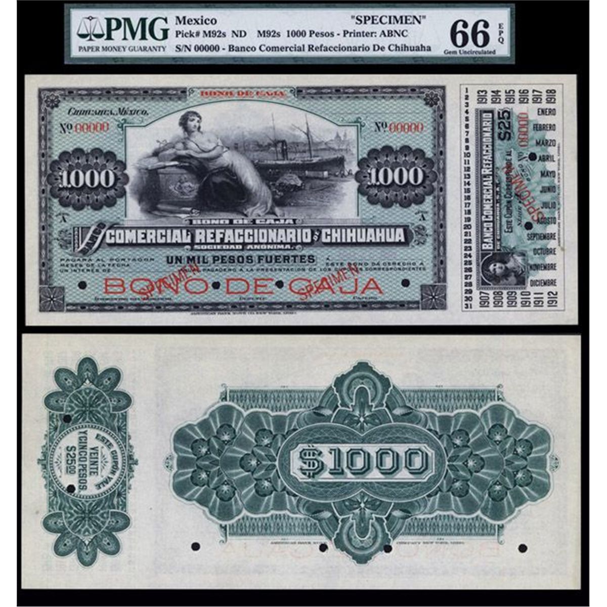 Chihuahua. ND (ca.1900), Ser. A. 1000 Pesos, P-Unlisted, (M92s), Specimen Bono De Caja banknote. Black and red on light green undertint with reclining allegorical woman with steamship at dock and train, back is green. There is a single coupon for $25 on the right border with an allegorical woman's portrait. Red specimen overprint, POC and “00000” serial numbers. The text has a blank space for the interest amount. Uncirculated to CU condition. ABNC. Rare “Bono De Caja” circulating bond banknote.