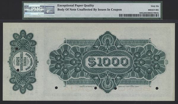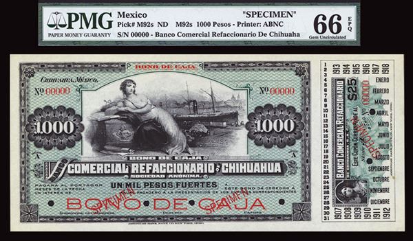 Chihuahua. ND (ca.1900), Ser. A. 1000 Pesos, P-Unlisted, (M92s), Specimen Bono De Caja banknote. Black and red on light green undertint with reclining allegorical woman with steamship at dock and train, back is green. There is a single coupon for $25 on the right border with an allegorical woman's portrait. Red specimen overprint, POC and "00000" serial numbers. The text has a blank space for the interest amount. Uncirculated to CU condition. ABNC. Rare "Bono De Caja" circulating bond banknote.