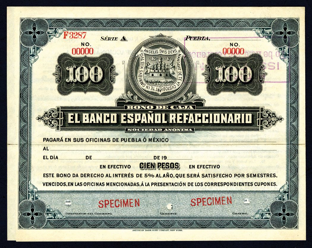Puebla, Mexico. ND, (ca.1900-1909). P-Unlisted. 100 Pesos Specimen. Dark blue border and black vignette on face with arms in middle, back blue with text. 6 coupons attached on right with Liberty facing left vignette. Red specimen overprint, POC and "00000" serial numbers. Archival fold horizontally, otherwise note would be uncirculated. Rare Bono de Caja. ABNC.
