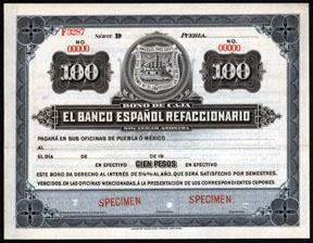 Puebla. ND, (ca.1908). P-Unlisted. 100 Pesos Specimen. Dark blue border and black vignette on face with arms in middle, back blue with text. 6 coupons attached on right with Liberty facing left vignette. Red specimen overprint, POC and "00000" serial numbers. Archival fold horizontally, otherwise note would be uncirculated. Rare Bono de Caja. ABNC.