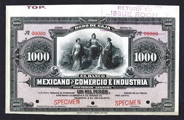 Mexico, ND, (ca.1900-1910). 1000 Pesos, P-Unlisted, Specimen banknote. Black on light purple underprint with 3 allegorical women in middle, back plum. Red specimen overprint, POC's and "00000" serial numbers. Excess margin on top with archival notation in pen. XF to AU condition due to archival handling. Rare note that is unlisted in SCWPM. ABNC.