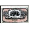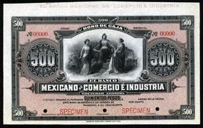 ND, (ca.1900-1910). 500 Pesos, P-Unlisted, Specimen banknote. Black on light brown underprint with 3 allegorical women in middle, back plum. Red specimen overprint, POC's and "00000" serial numbers. AU to Uncirculated condition. Rare note that is unlisted in SCWPM. ABNC.