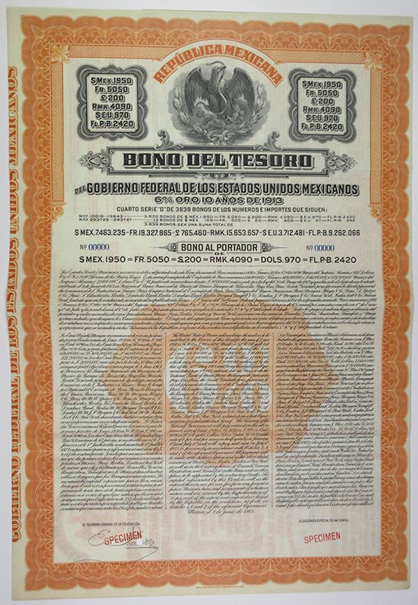 Mexico, 1913. 1950 Pesos - 200 Pounds - 6% 10-Year Specimen Bond, Black on orange border and underprint, Mexican arms with bald eagle with snake in it's beak and claw top center, Coupons attached, VF-XF condition, ABNC.