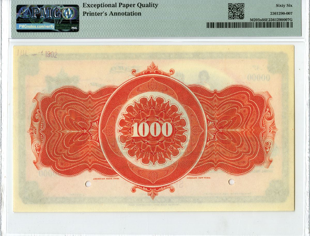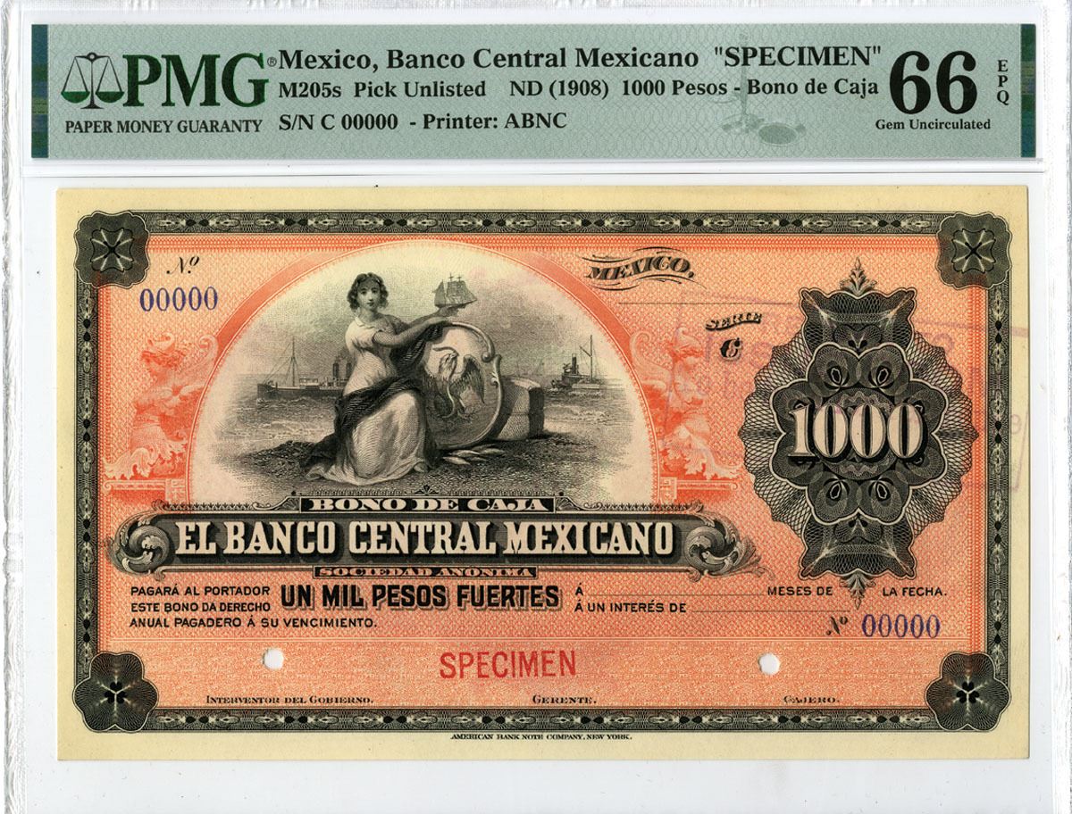 Mexico, 1902, 1000 Pesos, Series C, P-Unlisted M205s, Specimen Banknote, Black and red/orange print with seated allegorical figure beside shield at right with harbor scene in rear, Back orange-red, Specimen overprints and POC's, Overprinted in purple on back "JUL 1902", S/N C 00000, PMG graded Gem Uncirculated 66 EPQ with comment "Printer's Annotation," ABNC.