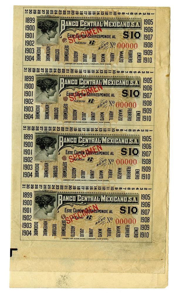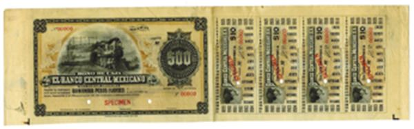Mexico, ND (OCT 1899 stamped in purple on top left margin), 500 Pesos Fuertes, Series B, P-Unlisted, Specimen, Black border, vignette and title with light brown underprint, locomotive passing signal towers on left, Back is brown with cycloid engraving and denomination. 4 coupons on left, Very Fine condition, 3/4" tear on the upper left top margin and splits have been archivally reinforced, bright colors and extremely artistic and tasteful design. Red specimen overprint, POC's and "00000" serial numbers. Rare circulating bond issued by the bank. ABNC.