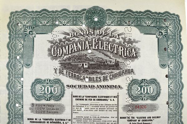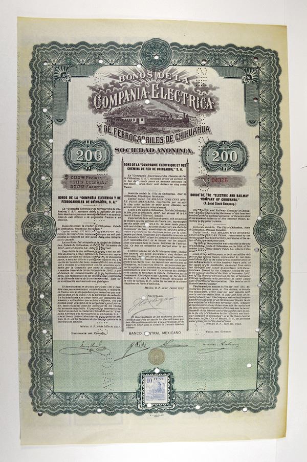 Mexico. 200 Pesos, 100 Dollars, 500 Francs Coupon Bond. Issued/Cancelled. Light paper tone. VF.
