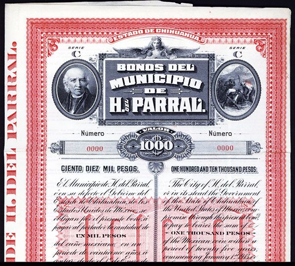 Mexico, 1908, 1000 Pesos, Specimen Bond, Black on red border and underprint, Notable figure portrait on upper left and mining vignette on upper right, Coupons attached, VF-XF condition, ABNC.