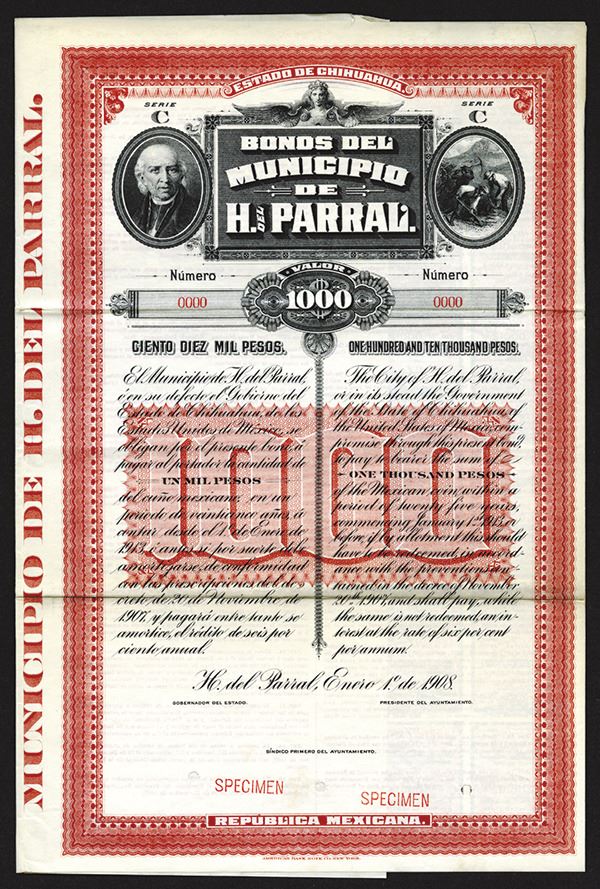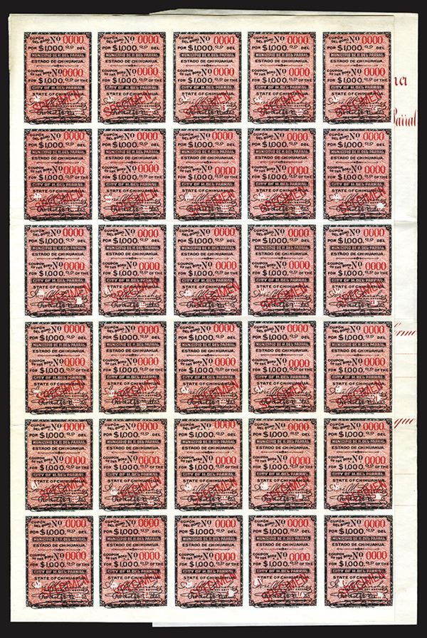 Mexico, 1908, 1000 Pesos, Specimen Bond, Black on red border and underprint, Notable figure portrait on upper left and mining vignette on upper right, Coupons attached, VF-XF condition, ABNC.