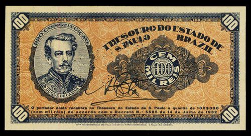 Sao Paulo, Brazil. Bonds of the Treasury, July 14, 1932. 100 Mil Reis, P-S875s, SPECIMEN, Black on chestnut brown underprint with portrait of Duque De Caixias on left, back blue on yellow, Pin-punch ESPECIME - W.J.C. IN MIDDLE, PMG graded Superb Gem 67 EPQ. Extremely rare note in any condition and this could possibly be one of the finest known, the highest graded and only one graded by PMG. Local printer.