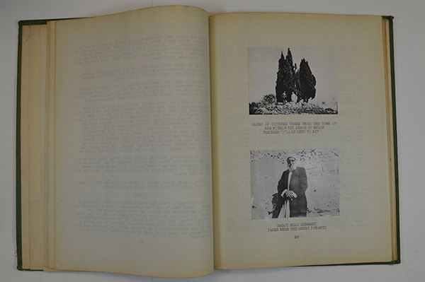 This manuscript recounts and documents the trip of 2 American BahaÍis visiting Abdul Baha in Israel in the year 1914. This is a certified copy, number 375, and signed by the author. Stamp on the back of the book is dated August 20, 1969.