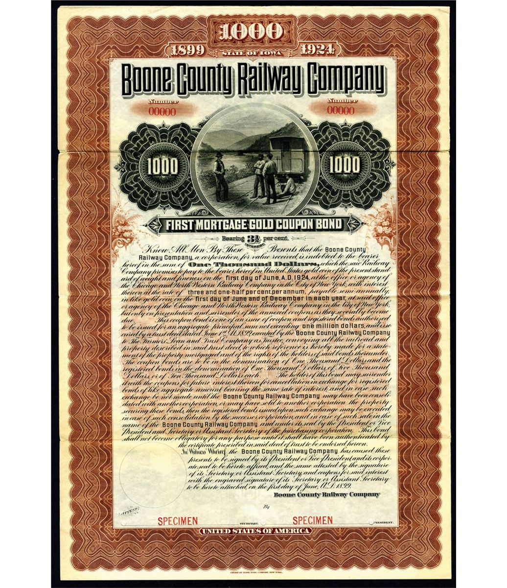 Iowa, 1899, $1000, Specimen, 1st Mortgage 3-1/2% Gold Coupon Bond Specimen. Brown border. Track workers sitting and standing on railroad tracks with caboose and river in background in circle. POC's. Coupons attached. VF condition with minor splitting at folds. Unlisted railroad in Cox and one of only 2 coupon bonds found in the archives. Rare bond.