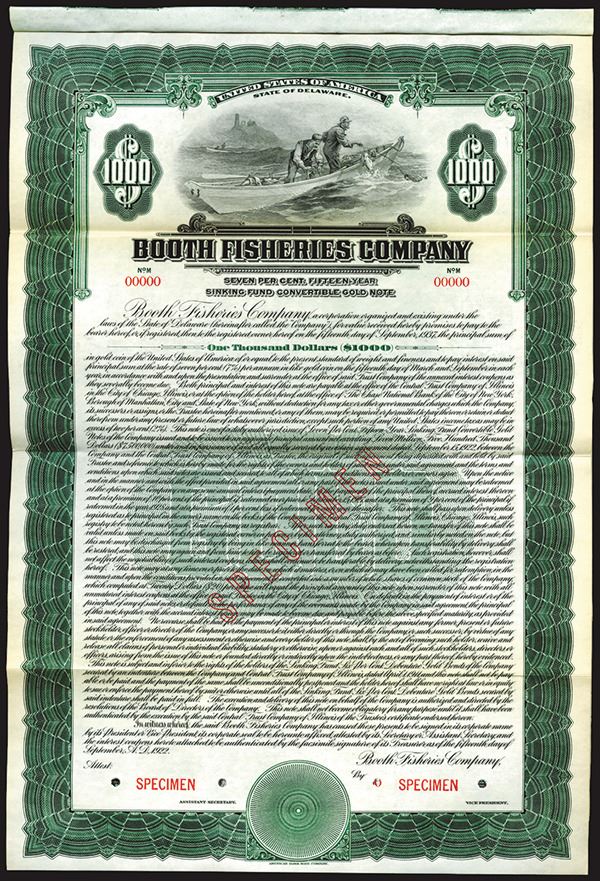 Delaware, 1922, $1000, Specimen 7% Sinking Fund Gold Coupon Bond, Two fishermen in small boat bringing in their catch with lighthouse and other fishermen behind them, VF-XF condition, ABNC.