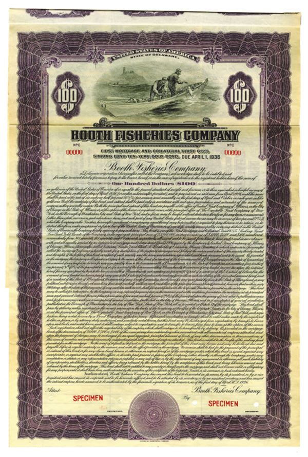 Delaware. $100 Specimen 6 1/2% 1st Mortgage and Collateral Trust Sinking Fund Gold Coupon Bond, Black print on purple border and under tint, Men fishing out on water at top, Specimen overprints and POC's, Fine condition with splitting along fold lines and minor toning over certificate condition, ABNC. Owns a large fleet of fishing boats on the Great Lakes and Pacific Ocean. Through the various companies controlled, company operates salmon and sardine canneries in Alaska, Puget Sound, Maine, and New Brunswick. Has five large cold storage and freezing plants.