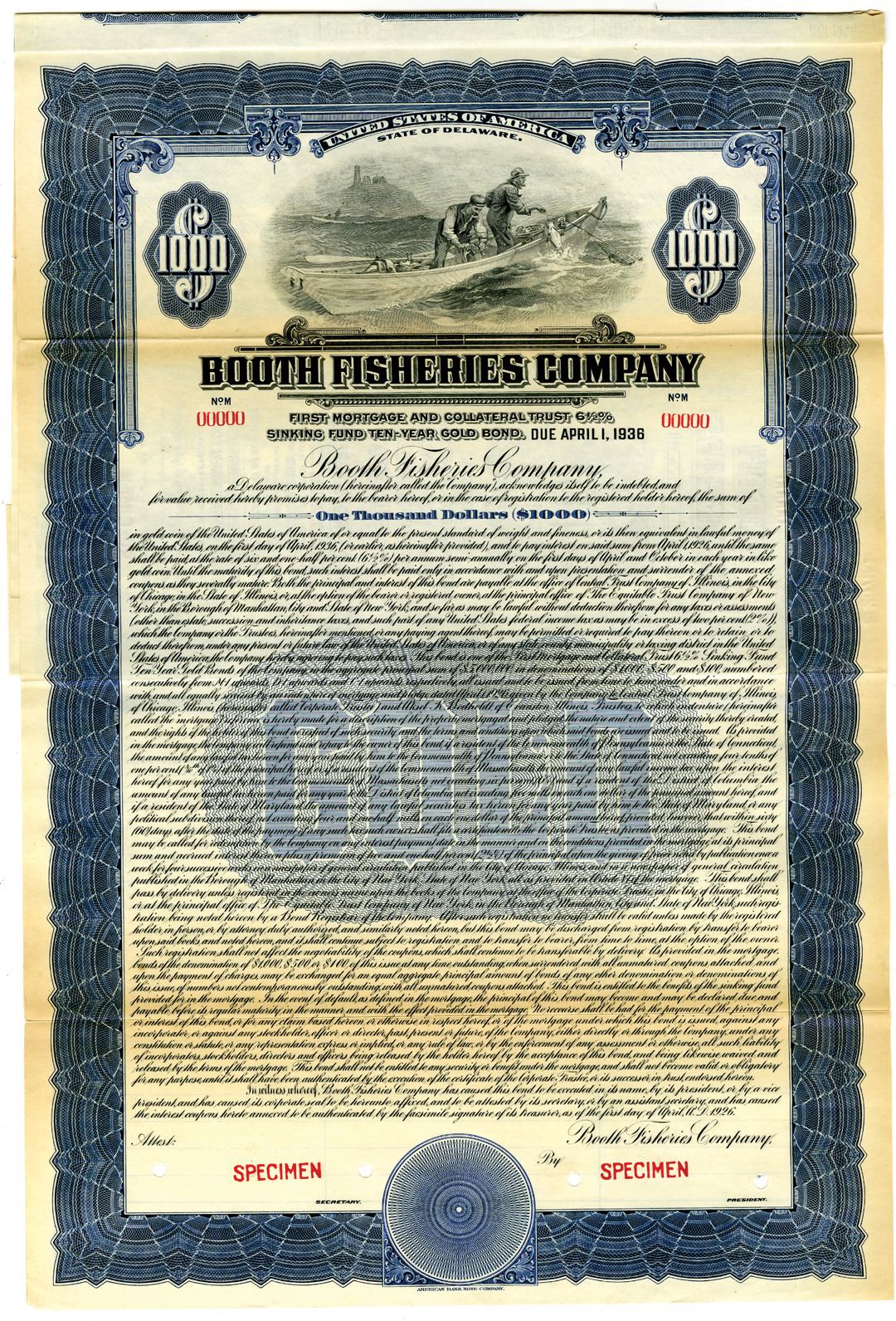 Delaware, 1926. $1000 Specimen 6.5% First Mortgage and Collateral Trust Sinking Fund Gold Coupon Bond, Black text with blue border and undertint, Men fishing at sea at top center. Red specimen overprints, 00000 serial numbers, and POCs. VF condition, ABNC.