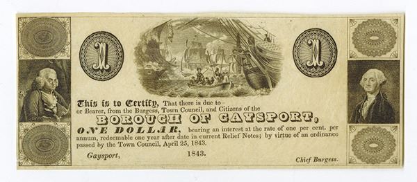 Gaysport, PA., $1, H 134-5, Remainder, XF to AU condition, Franklin at left, Washington at right and naval battle in middle, Scarce note rarely seen at auction.