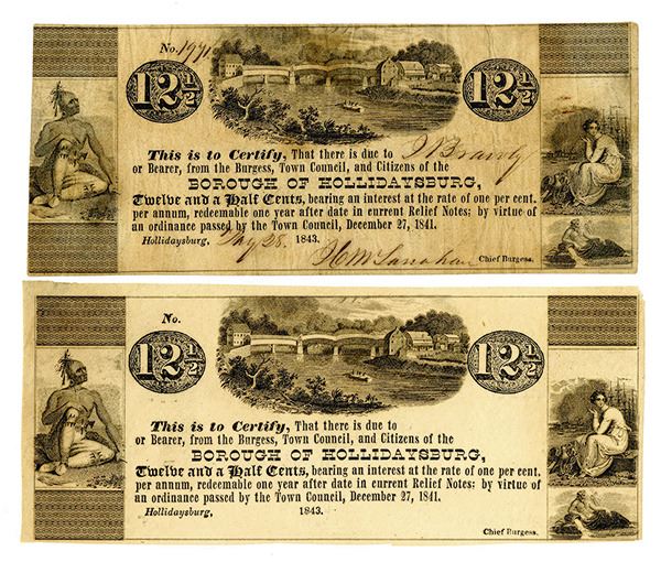 Hollidaysburg, PA., Lot of 2 notes, Includes 12 1/2 cents, H 159-17 Remainder, AU with mounting remnant on top right corner and similar design 12 1/2 cents, May 28, 1843, Issued, Fine to Choice Fine, H 159-17, both with seated allegorical woman on right and Native American at left with bridge in middle, Scarce notes rarely seen at auction.