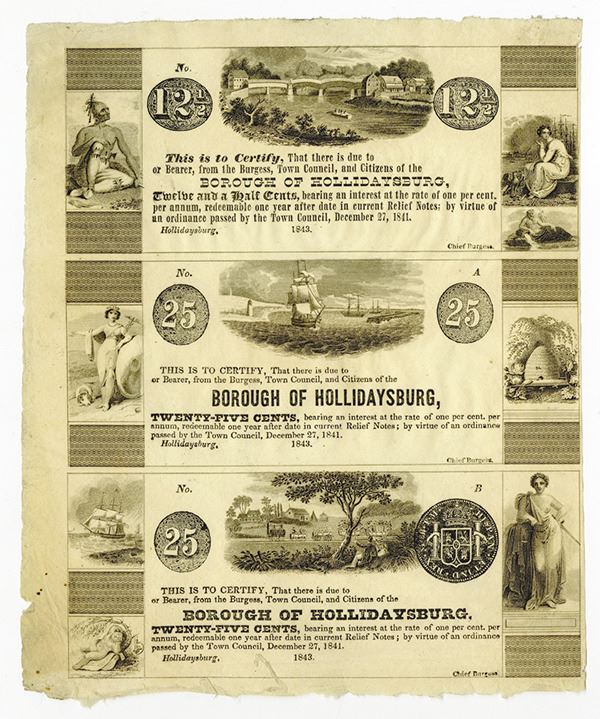 Hollidaysburg, PA., Uncut Sheet of 3 notes, 12 1/2cents; 25 cents; 25 cents; H 159-17; 159-18; 159-19, Remainders, AU to CU condition, Scarce notes rarely seen at auction. The 25 cent note has 2 significantly different varieties. This is possibly the only appearance of this or similar sheets since 1997. (ex-Smythe, 1997 Memphis Sale #165, Lot 1222).