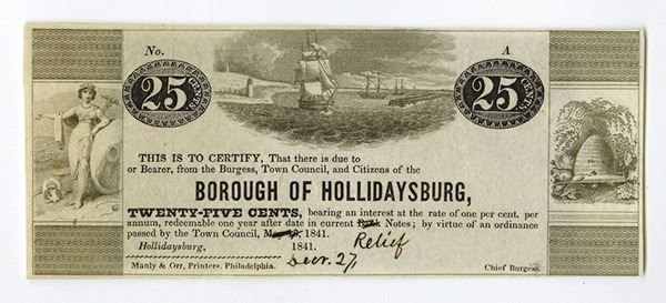 Hollidaysburg, PA., 25 cents, H 159-18, Choice XF to AU condition sailing ship in middle, allegorical woman on left and beehive on right counterfoil, Scarce note rarely seen at auction.