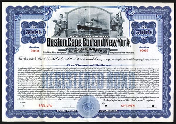 Massachusetts, 1910, $5000, 50-Year First Mortgage Registered 5% Bond Specimen, Black on blue border and underprint, Ocean liner top center flanked by female and male allegorical figures, VF-XF condition, Only 3 example found in the archives 12 years ago, rare and very attractive. ABNC.
