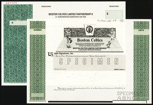 Delaware, 1980's, 1 Specimen Bond and 1 Specimen Stock, Black on green borders and underprint, basketball players and team logo o top, VF-XF condition, ABNC.