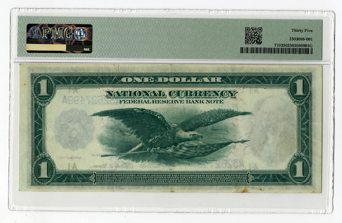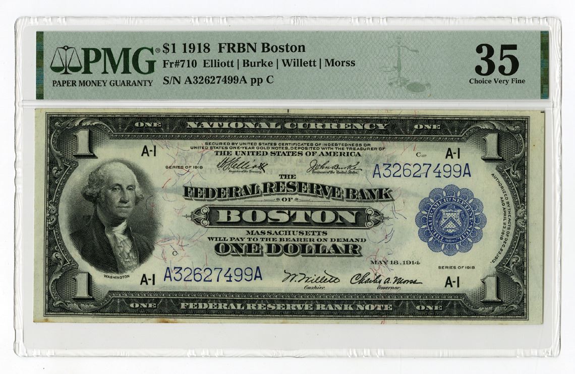 Boston, Massachusetts, 1918. $1, P-371 Fr#710, Issued Banknote, Black printing with portrait of George Washington at left, Back is green with Eagle and Flag at center, Signed by Elliott | Burke | Willet | Morse, S/N A32627499A pp C, PMG graded Choice Very Fine 35