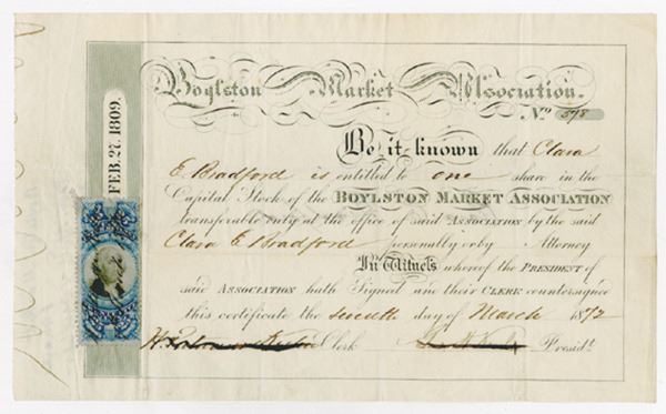 Massachusetts. 1 Share Capital Stock Issued and Cancelled Stock Certificate, Black print with simple border and ornate title at top, Revenue stamp at left side, VF-XF condition. Boylston Market (1810-1887), designed by architect Charles Bulfinch, was located in Boston, Massachusetts, on the corner of Boylston and Washington Streets. Boylston Hall occupied the third floor of the building, and functioned as a performance and meeting space. The Boylston Market Association developed the building. John Quincy Adams served as the association's first president. In 1809, the proprietors paid $20,560 for the land formerly belonging to Joseph C. Dyer (and to Samuel Welles before him). The new building "was named to honor the benevolent and philanthropic Ward Nicholas Boylston.
