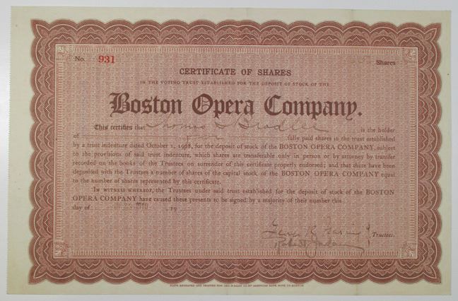 Massachusetts, 1910. 5 Shares I/U Stock Certificate, Dark brown text with brown border and background. VF condition, ABNC. The Boston Opera Company (BOC) was an American opera company located in Boston, Massachusetts, that was active from 1909 to 1915.