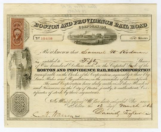 Massachusetts, 1863. 50 Shares Capital Stock I/U Certificate, Black on black border, Water scene at top and left side, VF-XF condition, Rawdon, Wright & Hatch.