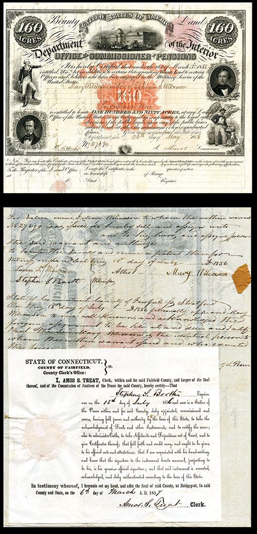 Connecticut, 1856, 160 Acres Department of the Interior Bounty Certificate, Issued to the widow of a Revolutionary war veteran and then transferred on the back, Black on orange-red underprint with Capital on top flanked by George Washington and Dobbin at left and Franklin Pierce and Sailor with flag on right with underprint “Bounty Land 160 Acres” with shield, canons and flages, VF to Choice VF condition, Rare in high grade. RWH&E.
