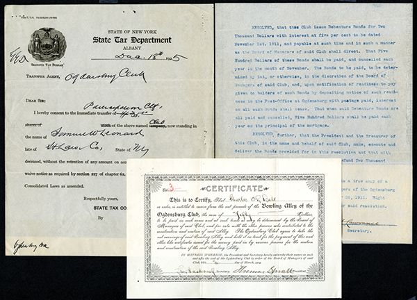 Bowling Alley of the Ogdensburg Club. 1904. Ogdensburg, New York, 1904. $50 Issued Certificate. For the erection of a bowling alley, EF. With accompanying NY State Tax Department document. A rarely seen subject in scripophily.