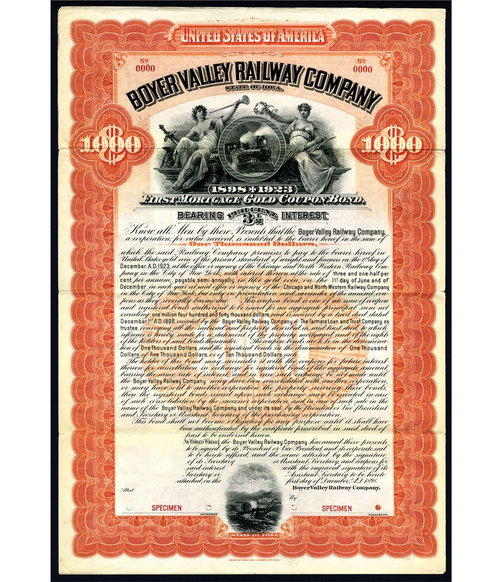 Iowa, 1898, $1000, 1st Mortgage 3-1/2% Gold Coupon Bond Specimen. Orange border. Allegorical man and woman flank locomotive in circle on top, Iowa Arms at bottom. Red specimen overprints, POC's. Coupons attached. VF condition with minor splits on the left horizontal fold by the margin. Unlisted railroad in Cox and the first time we have offered a coupon bond on this line. One of only 2 found in the archives and the only one available. ABNC.